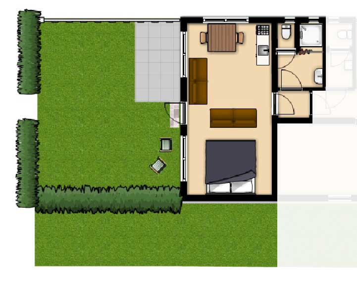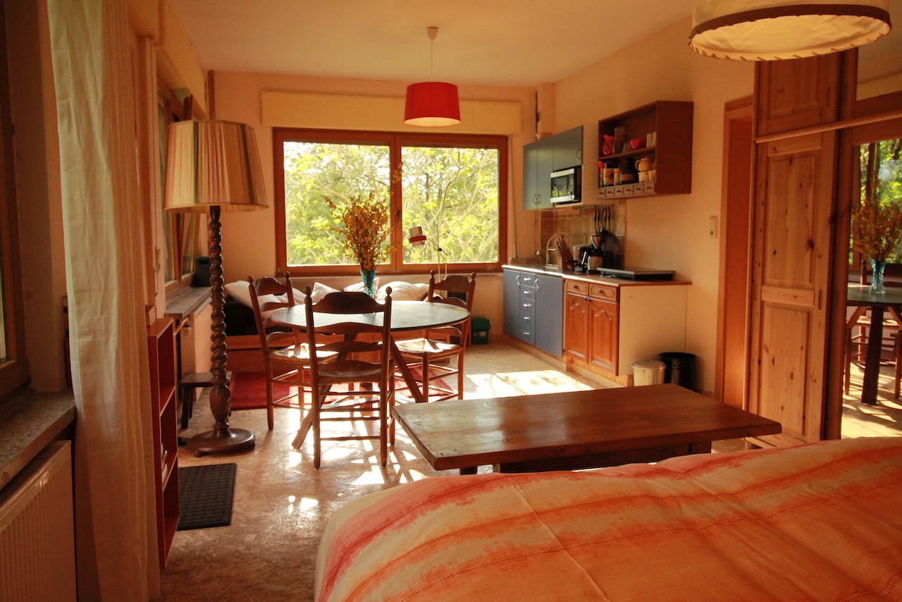 Im Süden des Hauses liegt das kleine Apartement (28 m ²) mit einem großzügigen, sonnigen Wohnzimmer, einer Küchenzeile und einem separaten Garten von 36 m ². Das Wohnzimmer verfügt über große Fenster welche viel Licht bieten und man hat einen Blick in den eigenen Garten auf das Tal und die Hügellandschaft. Das Badezimmer verfügt über eine Dusche, ein Waschbecken und einen WC. Das große Doppelbett hat eine hohe Einstieg, so dass Sie leicht rein und raus kommen. In der Wohnung hat man von morgens bis abends viel Tageslicht, obwohl sie sehr geschützt ist und man nicht reinschauen kann. Sie können somit von der Natur geniessen, sowohl innerhalb wie auch ausserhalb des geschützten Gartens.